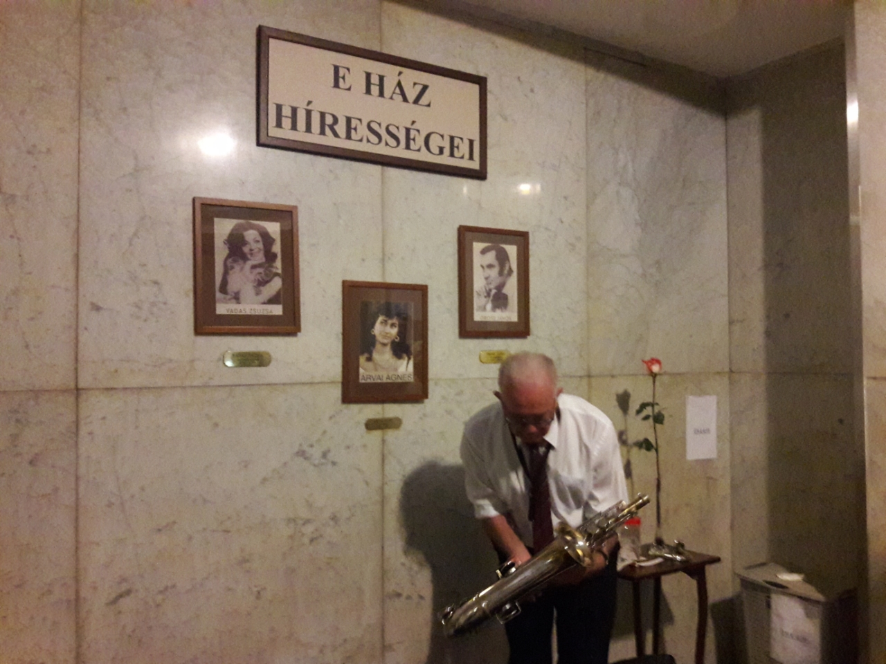 That afternoon, the memorial was taking place right on the sidewalk in front of the Art-Deco apartment building Seress called home for decades. His friend, jazz performer “Bubi” János Beamer lived in the same building, as did numerous other popular performers of the era. A memorial plaque and wreath honoring Seress are on permanent display beside the front door of the house.