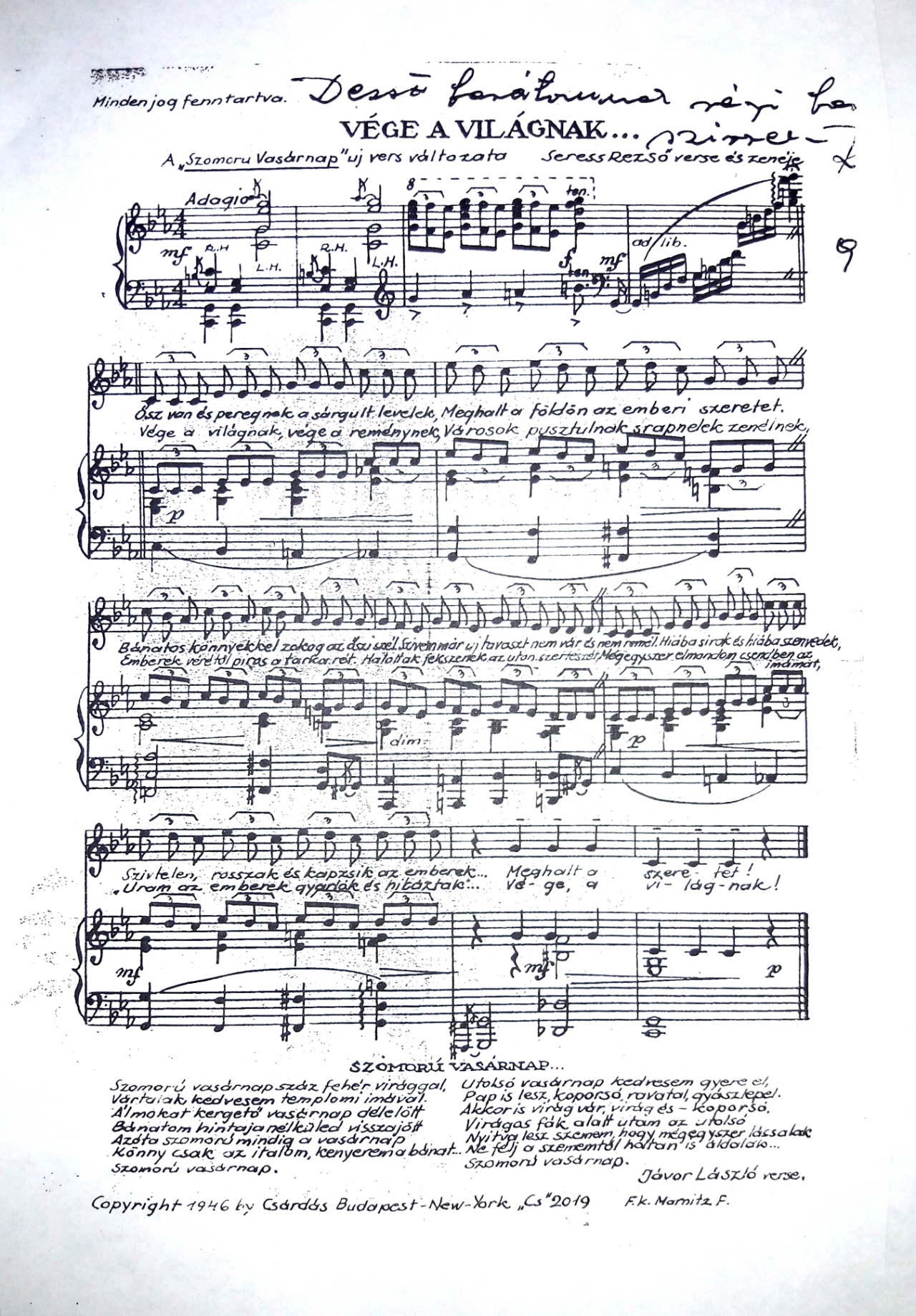 This early version may never have been recorded. Rather, it was a second set of totally different, darkly romantic lyrics written by Jávor László, which became the better known Gloomy Sunday. This version became infamously known as the Suicide Song, supposedly linked to a spate of suicides in wartime Europe. Seress himself survived a leap from his apartment window to die in the hospital by his own hand.