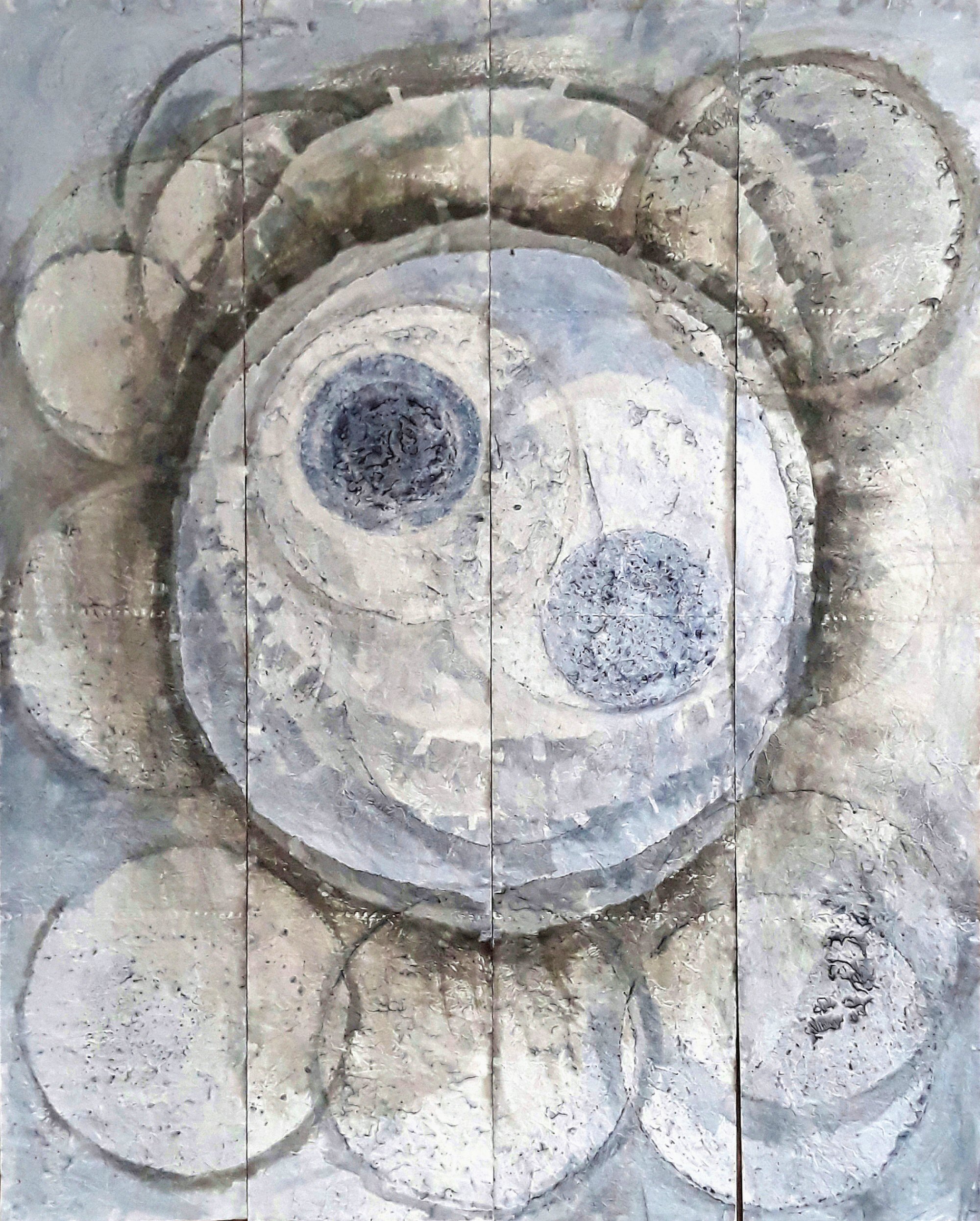 “CHAOS AND CATHARSIS, WORKS ON A CONTINUUM” presents selections from past decades of work done in Vermont and Budapest. The “Reconstructed Fragments Series” (2011), “Fragmentum Series” (2013), “Dialogs with József Attila Series” (2017), and my latest large collages “21st Century Icon Series” all focus on a continuum of fragmentation and chaos, reunification and repair, exploring through collage and paint themes more pertinent than ever.