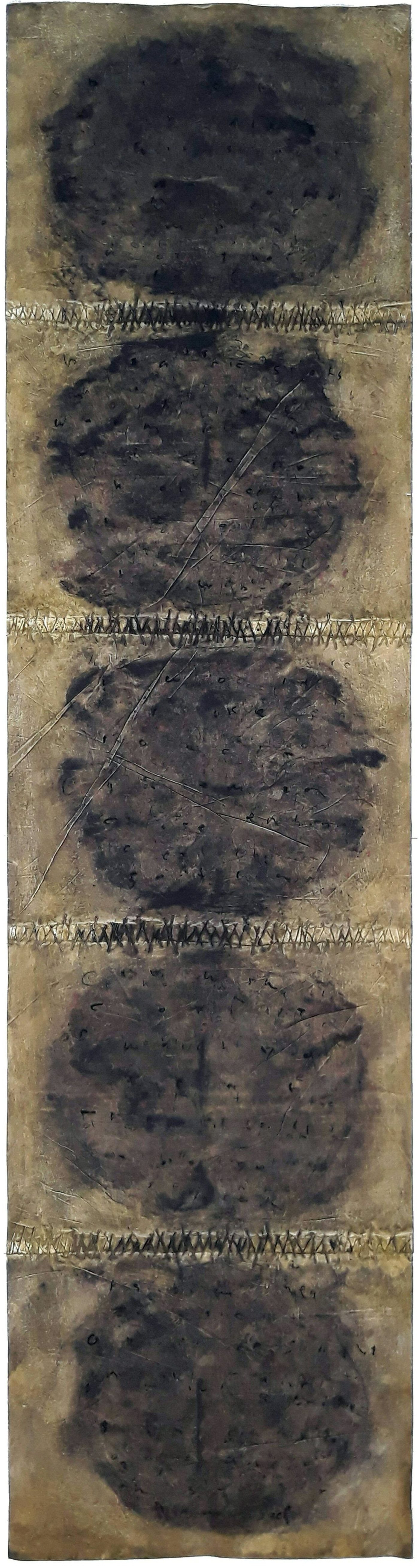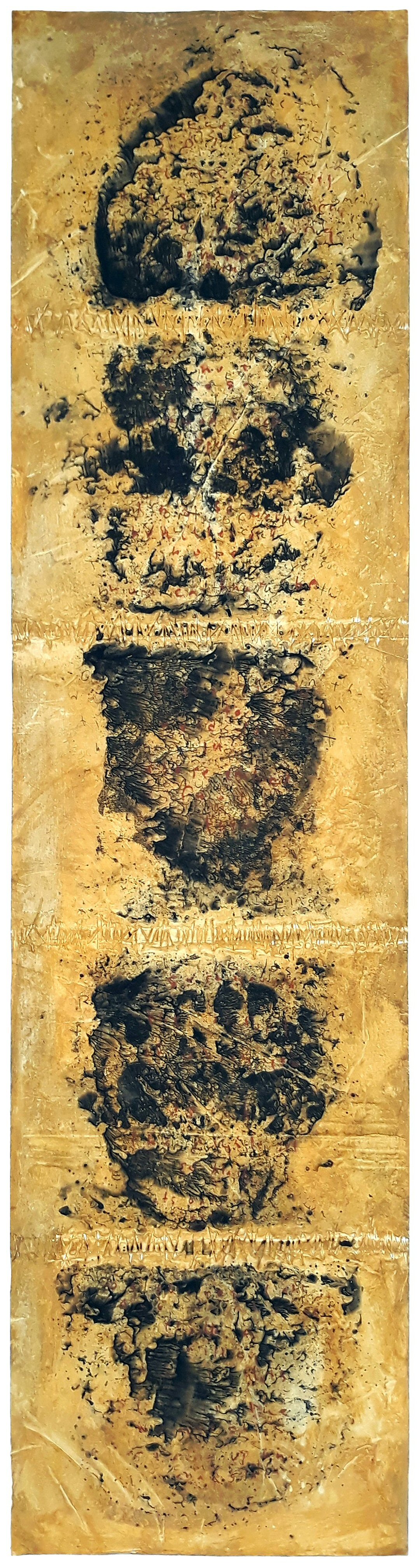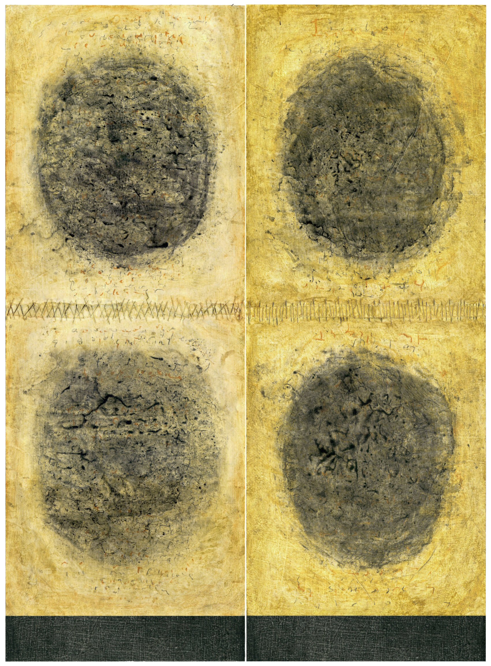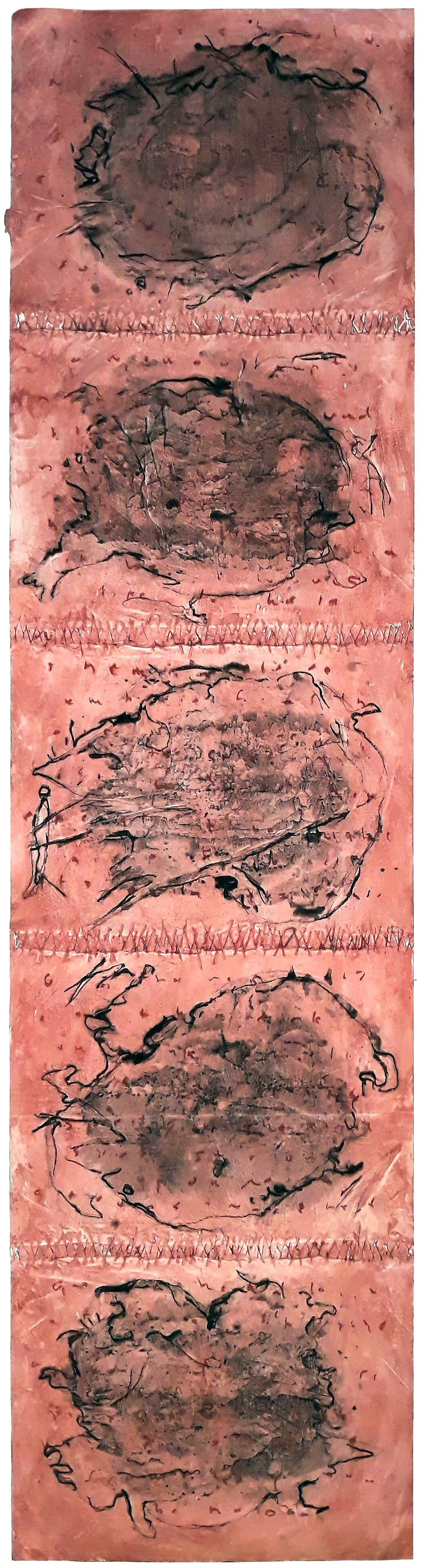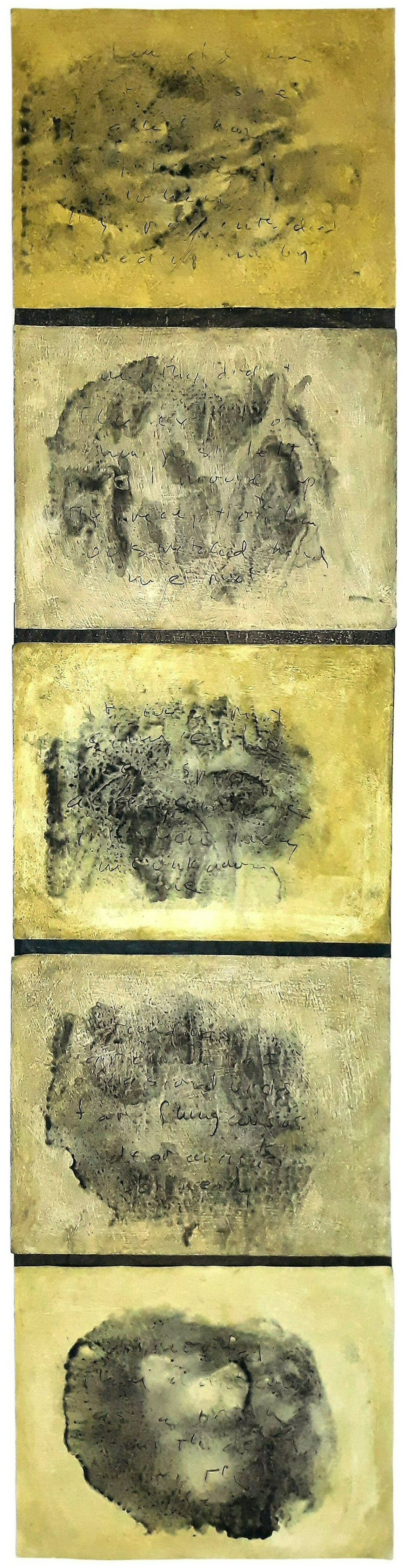 The Black Spots of Winter Series emerged organically, a visual response to serious conversation and correspondence regarding this very black winter of 2019. Returning to work after a three month hiatus, resuming method and media but with a different voice. How to expand into greater use of form while keeping the use of writing as a drawn mark-making? Experimentation soon led to the use of the printed circle, transferred repeatedly from wetted paper to wetted paper by simple pressure. The use of the black circle developed quickly into a new symbol, adding dark notes to the already established fields of stained color and scrawled mark-making.