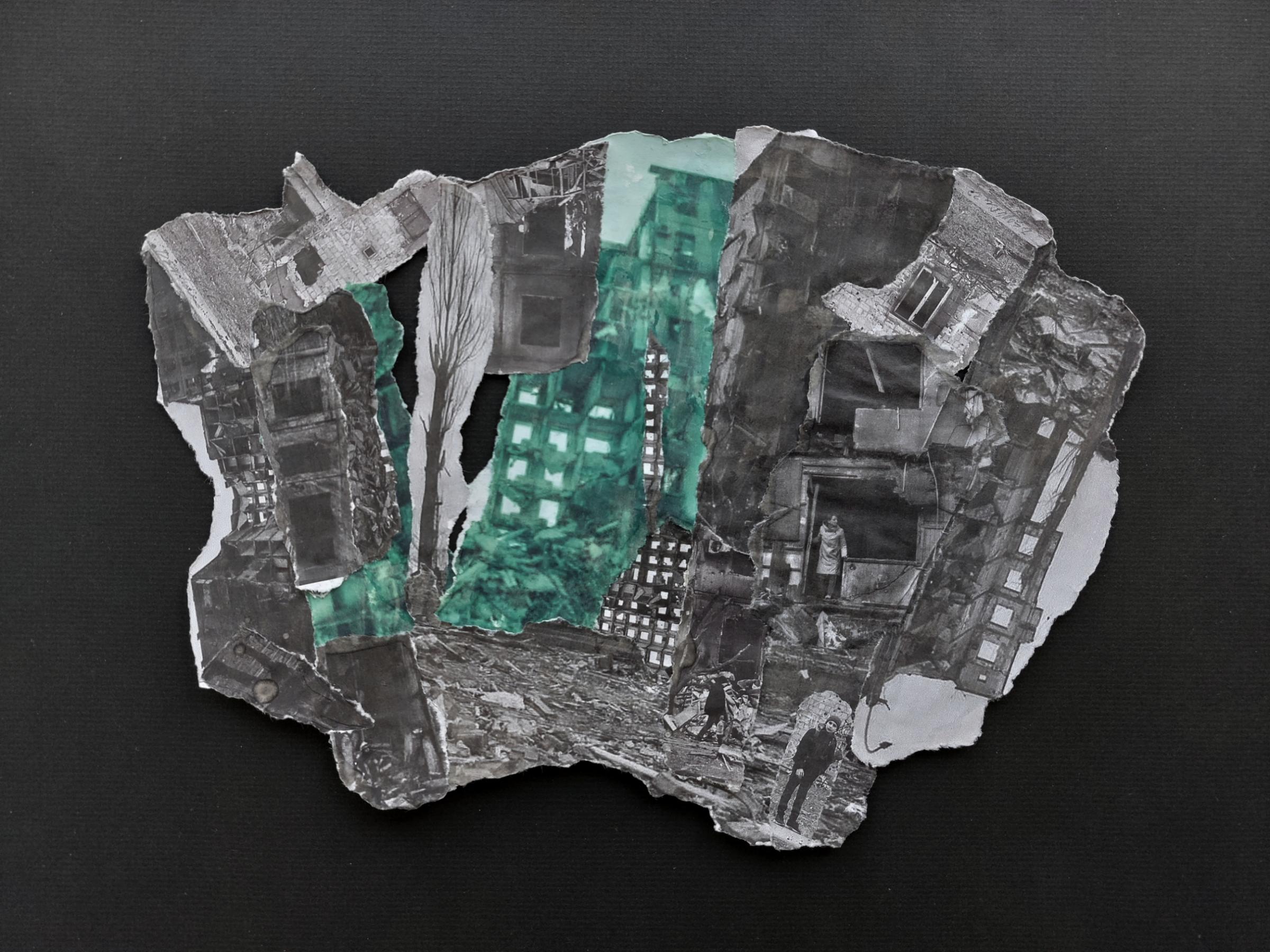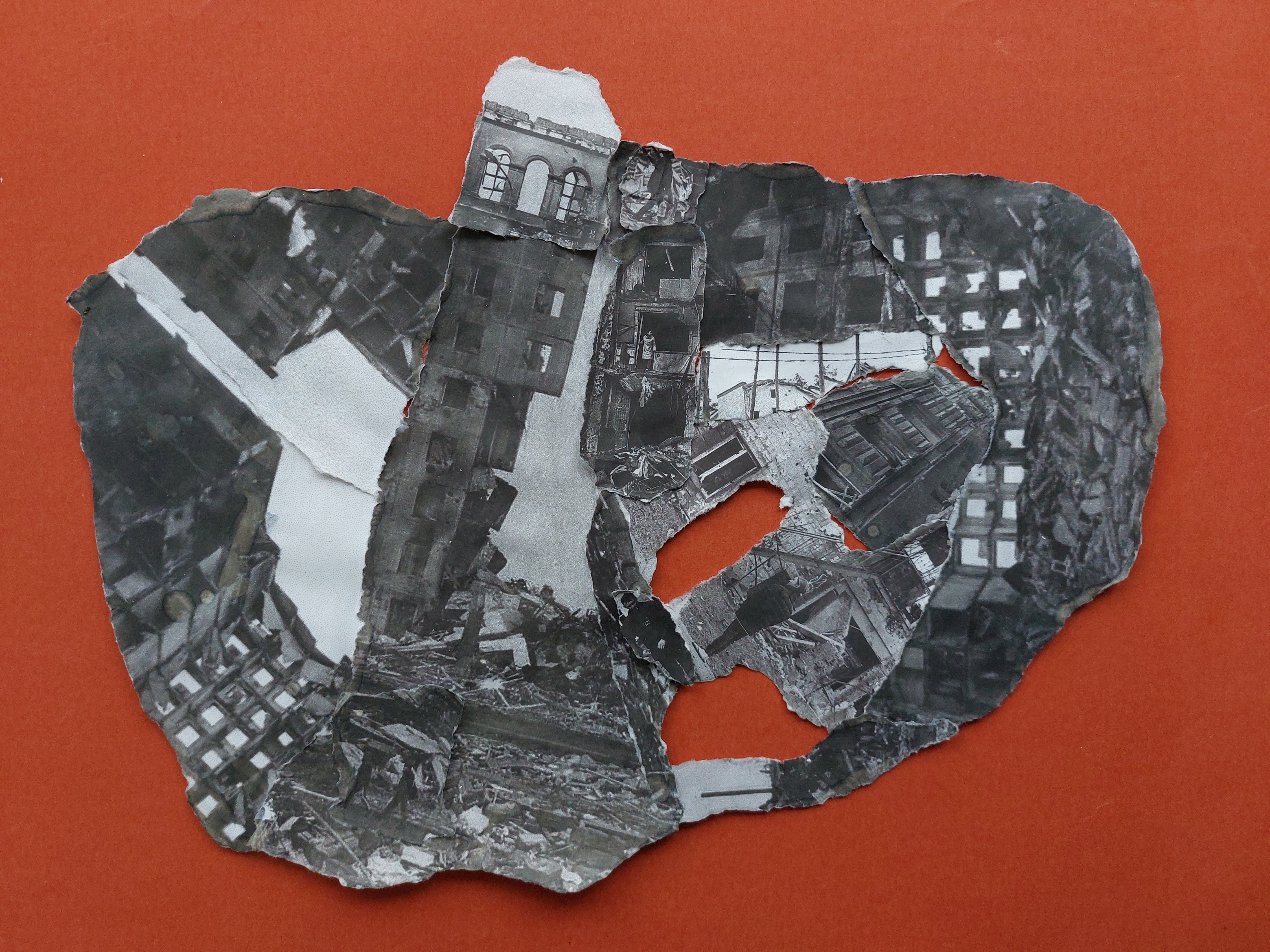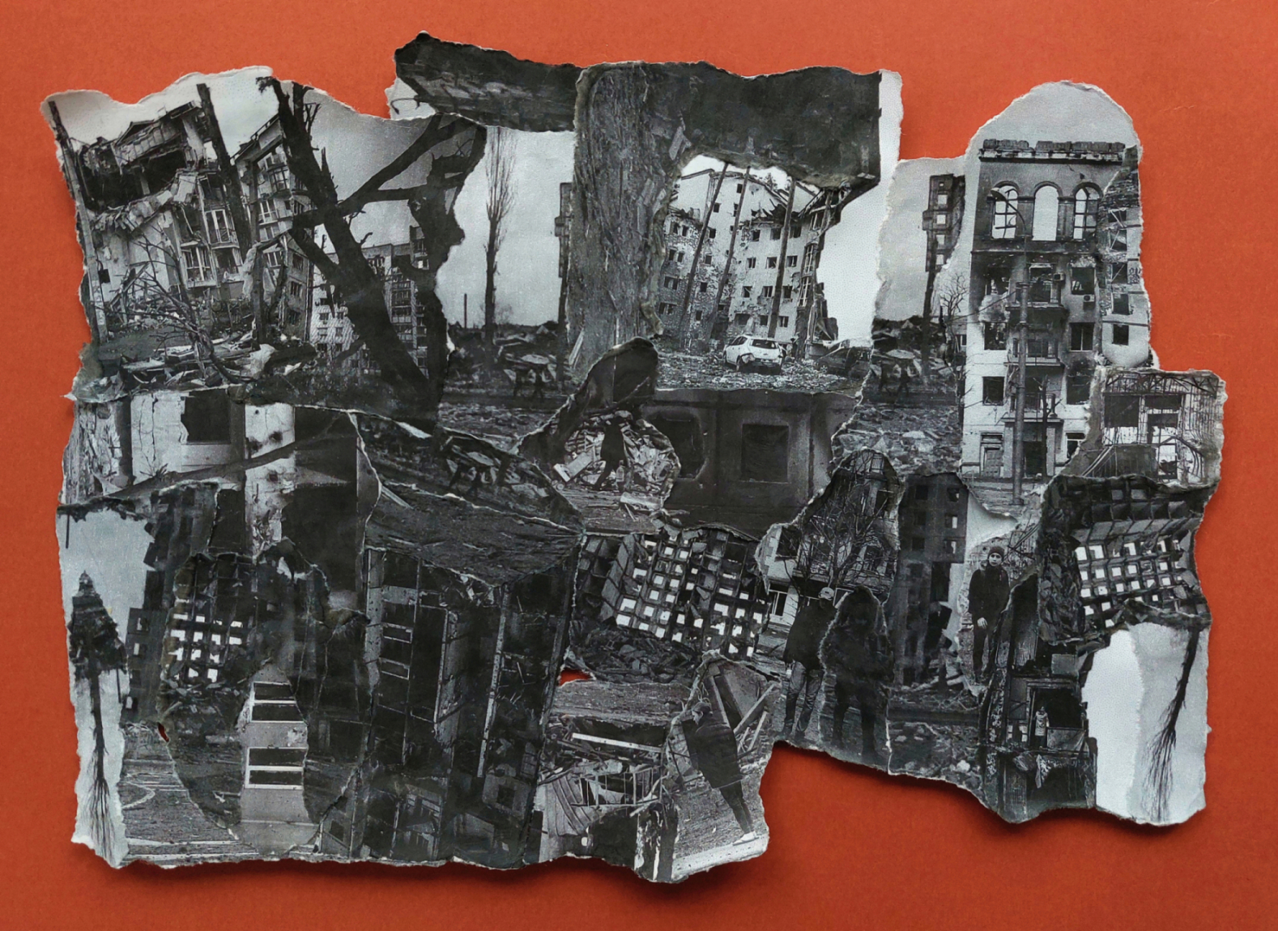 This time the papers were simple black and white ink-jet prints of digital photos downloaded from online newspapers and news sites – photos of cities in Ukraine utterly destroyed by Russian missiles. A tiny wet brush outlined small fragments for easy tearing, then these barely overlapping fragments were pieced and taped together for eventual gluing. I couldn’t help but notice that the verso sides presented interesting groupings of the blank paper fragments; however, these were essentially one-sided works, floated on a red or black background paper.