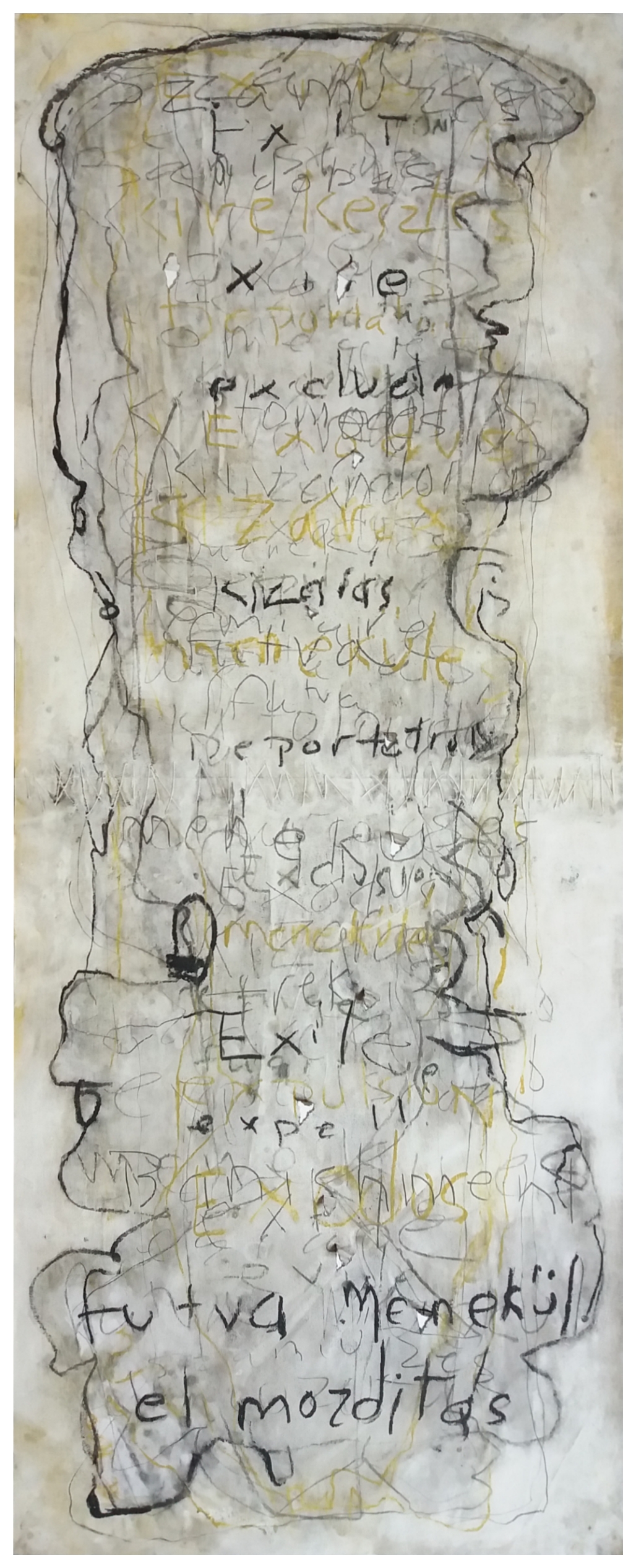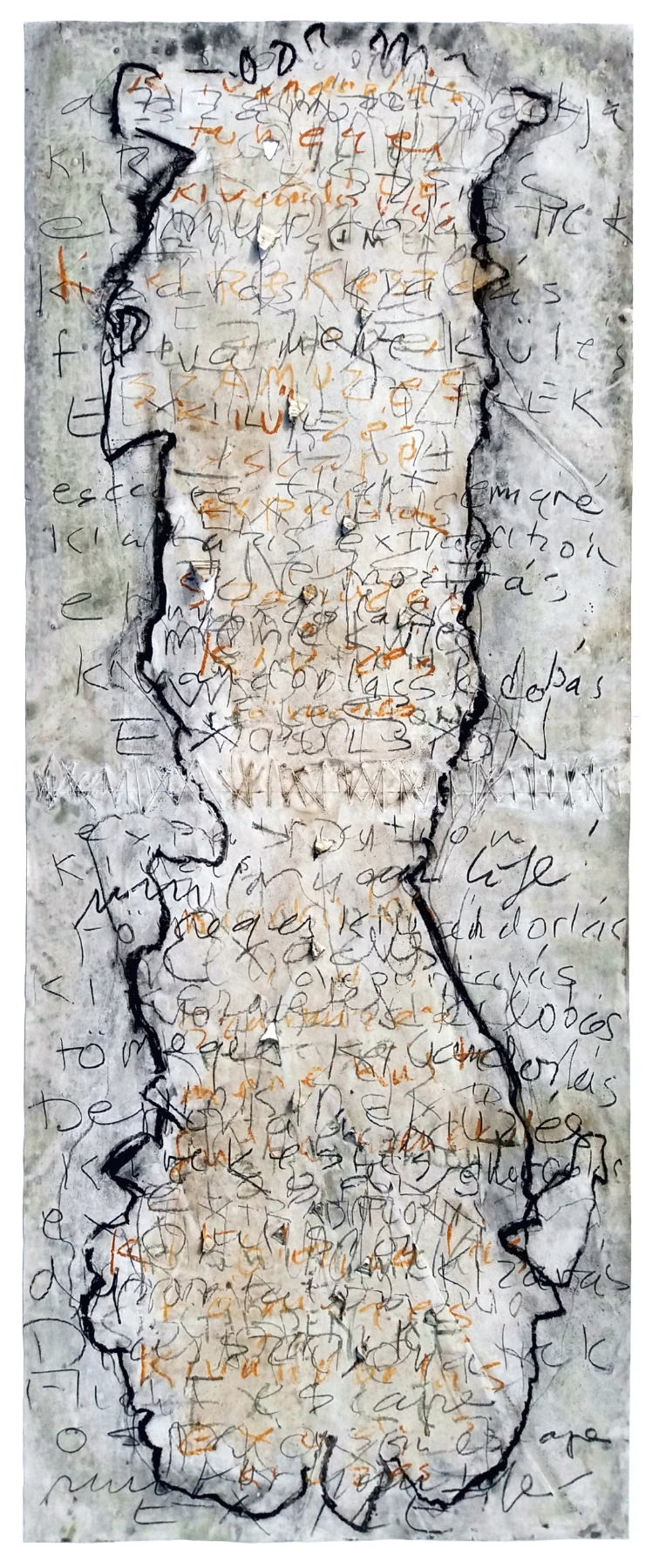 In this newest series I collected synonyms and words related to exile in both Hungarian and English. Working in the same manner as in the Dialogs series, I inscribed dual, overlapping vocabularies with wet chalks onto the same water-soaked, stitched paper. The words, scrawled in different hues and overlapping in an act of abstract markmaking, fused together to suggest figural forms as the words lost and regained their significance… exile, exodus, exclusion, expulsion, extradition, escape, emigration, expatriation, excommunication, eviction, evacuation, eradication, elimination, extradition, banishment, deportation, displacement, diaspora, dispersion, departure, flight, fugitive, migration, immigration, emigration, out-migration, ostracism, separation, rejection, alienation… and that’s just the English.