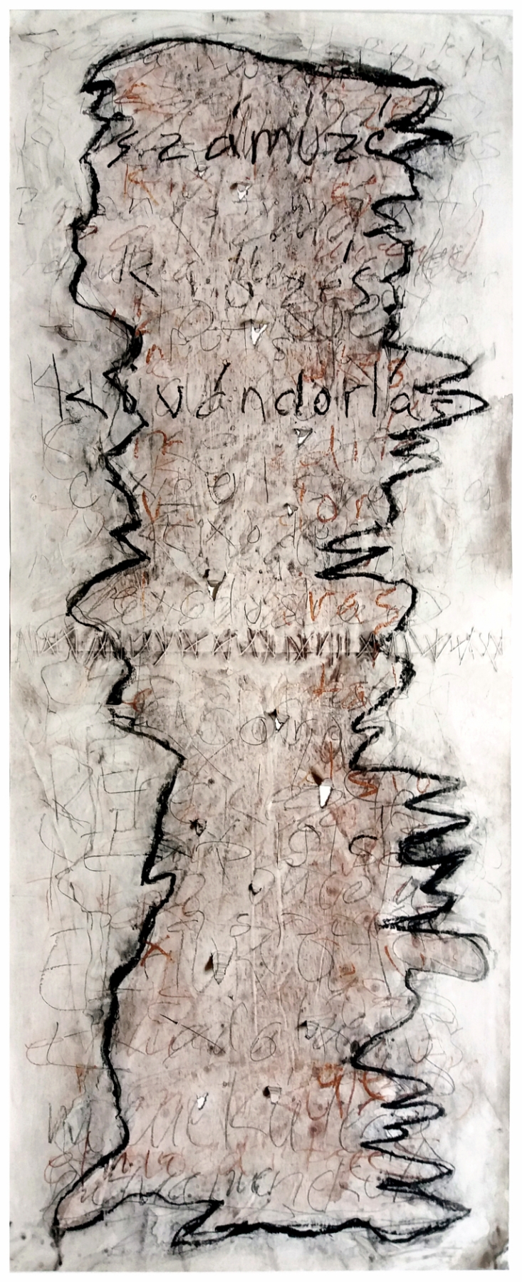 Work began on my new Exile Series in response to a call for entries for the Hungarian Painters’ Association fall 2017 juried exhibition entitled Garden of Exile. My entire Exile series was completed at the Bérnecebaráti Artists’ Colony in the early fall; these new works began, as did the recently exhibited Dialogs with Attila József Series, with words.