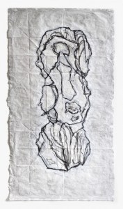 Black and white lines incised repeatedly into the bed of grey overlapping marks remind me of Giacometti’s insistent pursuit of elusive form. That association pleases me.