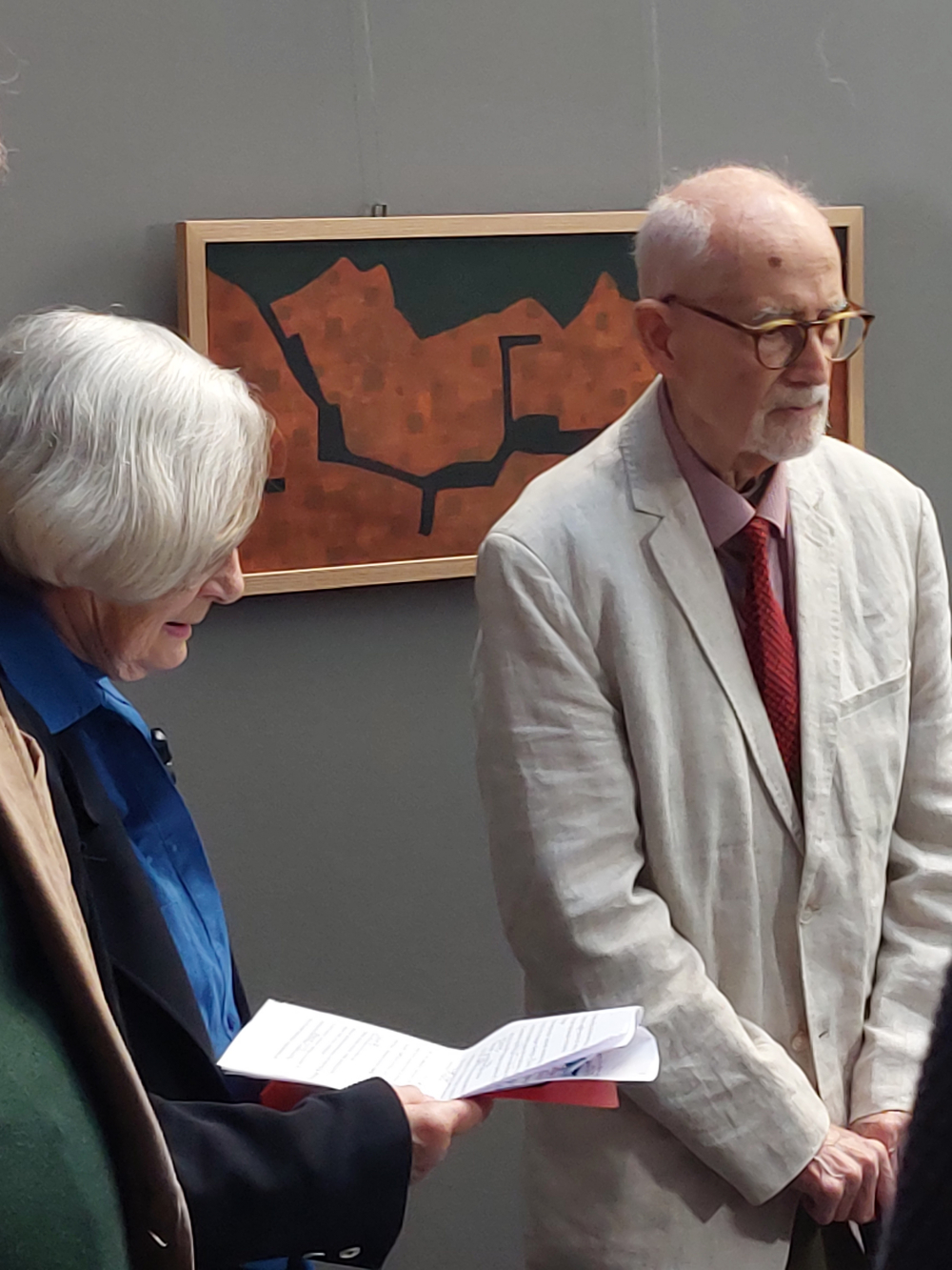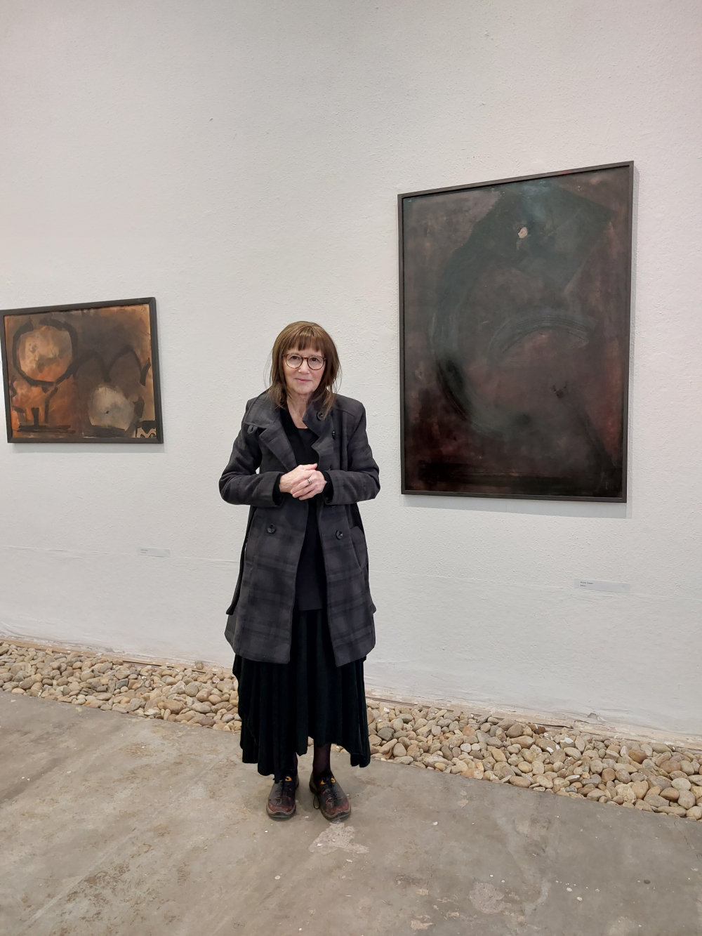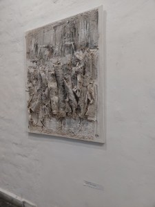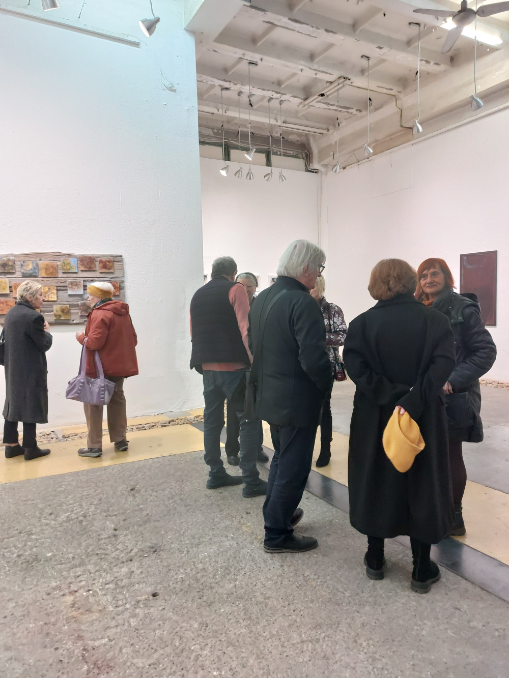 The show is “Négyen másképpen” (Four Different Ways) and features works of four women artists; my dear friend MÓZES KATALIN as well as that of ZOLTAI BEA, KRAJCSOVICS ÉVA and KOVÁCS JOHANNA, all members of the MAGYAR FESTŐK TÁRSASÁGA (Society of Hungarian Painters). Kati Mózes’ nuanced new paintings were dark, Bea Zoltai’s vigorous mixed media collage/paintings were dark as well, while Johanna Kovács’ white textural relief pieces and Éva Krajcsovics’ minimalist color field paintings veered into different explorations. The event was opened by poet Zoltán Halasi. This was my first chance since my last trip in the winter of 2022 to reconnect in person with many of my friends and art colleagues.