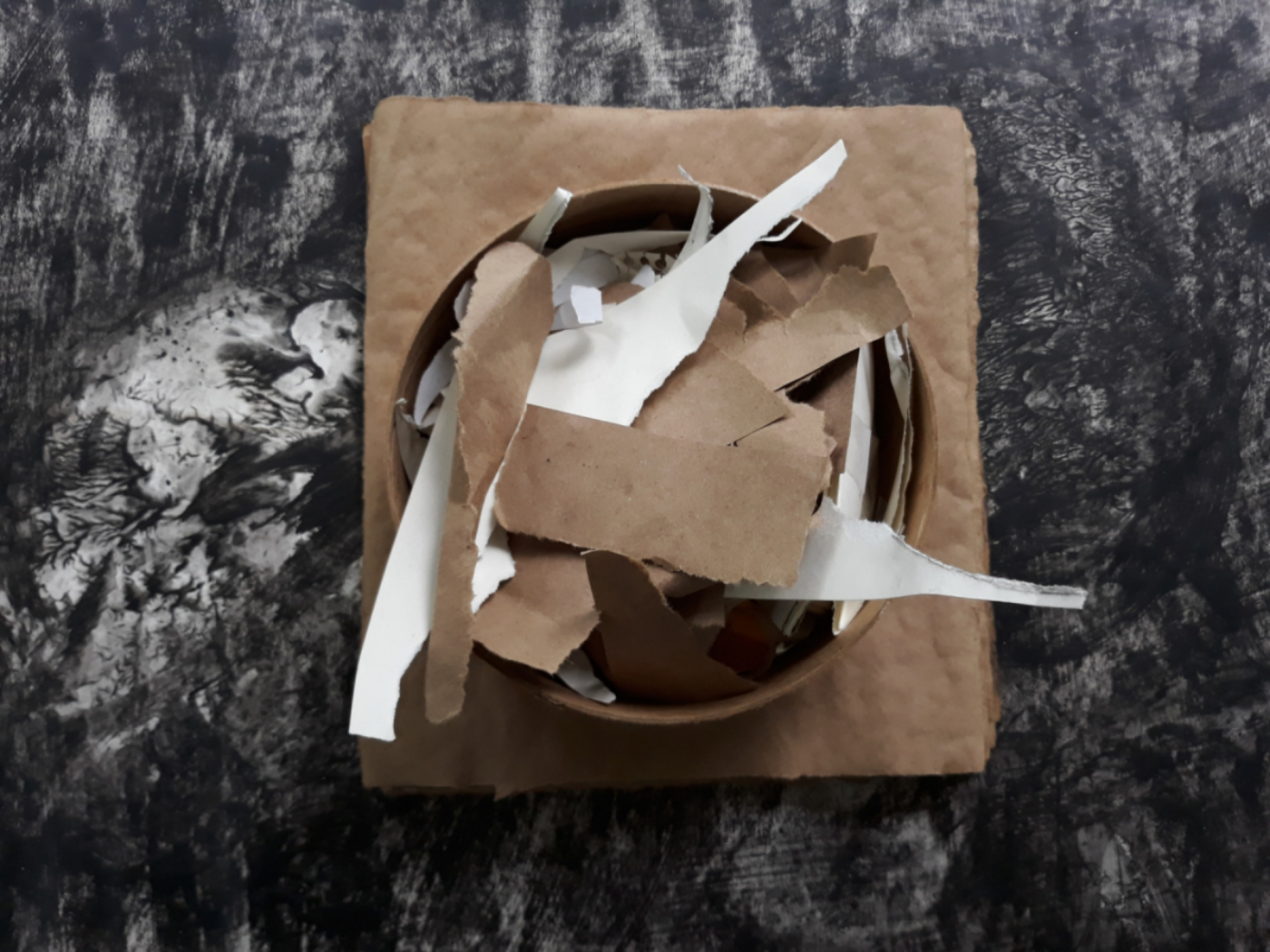 Am I working? Well, yes. Finished the new quadriptych of small mixed-media pieces on gessoed unfolded paper bags (came all the way from home holding our travel lunch – Vermont cheddar cheese sandwiches). Am busy framing this new work for an upcoming juried Társaság group exhibit in the nearby city of Eytk. A few more mixed-media explorations are in the works as well.