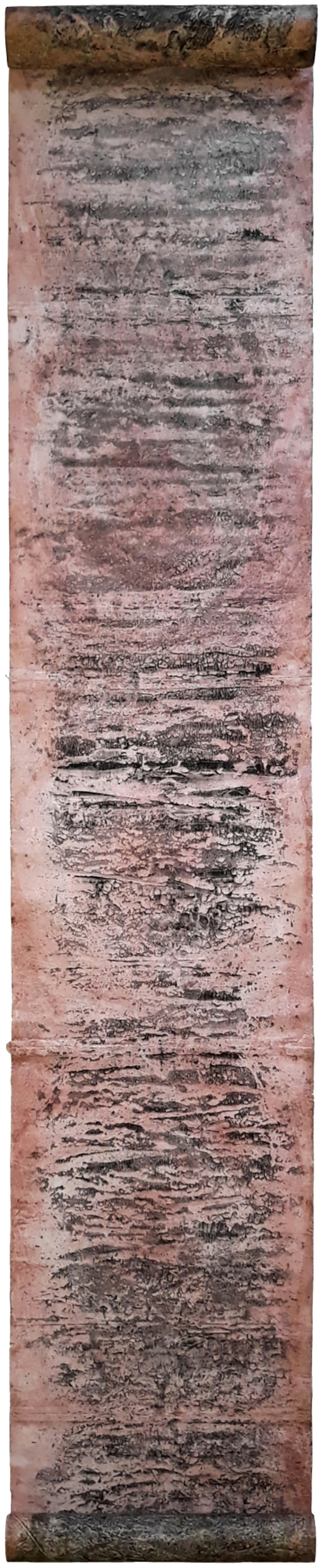 Presenting itself as a piece to possibly be viewed flat – read in an act of scrolling and unscrolling, the work process continued as before. Two small wetted pages blackened with dense chalk spheres were repeatedly pressed into the acrylic-stained scroll, transferring the black forms in a rough offset process. The scroll was then rolled up and the motion and pressure of rolling created a somewhat linear-reading sequence of marks and forms. These two images are front and verso of the one 67 inch scroll.