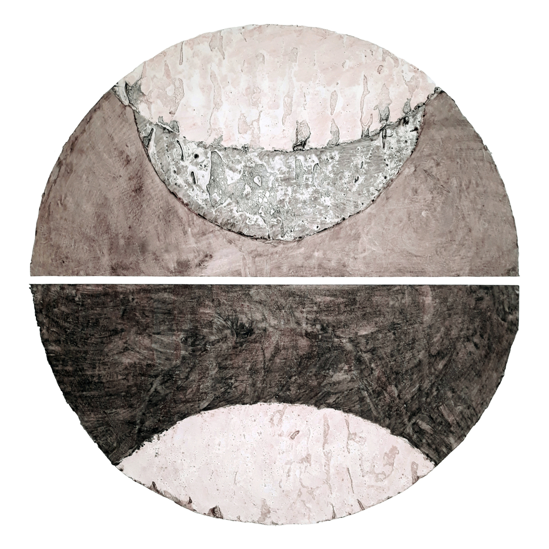 At this point in time, one double-sided diptych Spheres of Destiny I and II has made its way to Budapest in my stead, currently exhibited in the HORIZONTjuried exhibition of the Society of Hungarian Painters (Magyar Festők Társasága). In fact it was the exhibition theme which led to this format of spherical paper diptych with central horizontal gap.