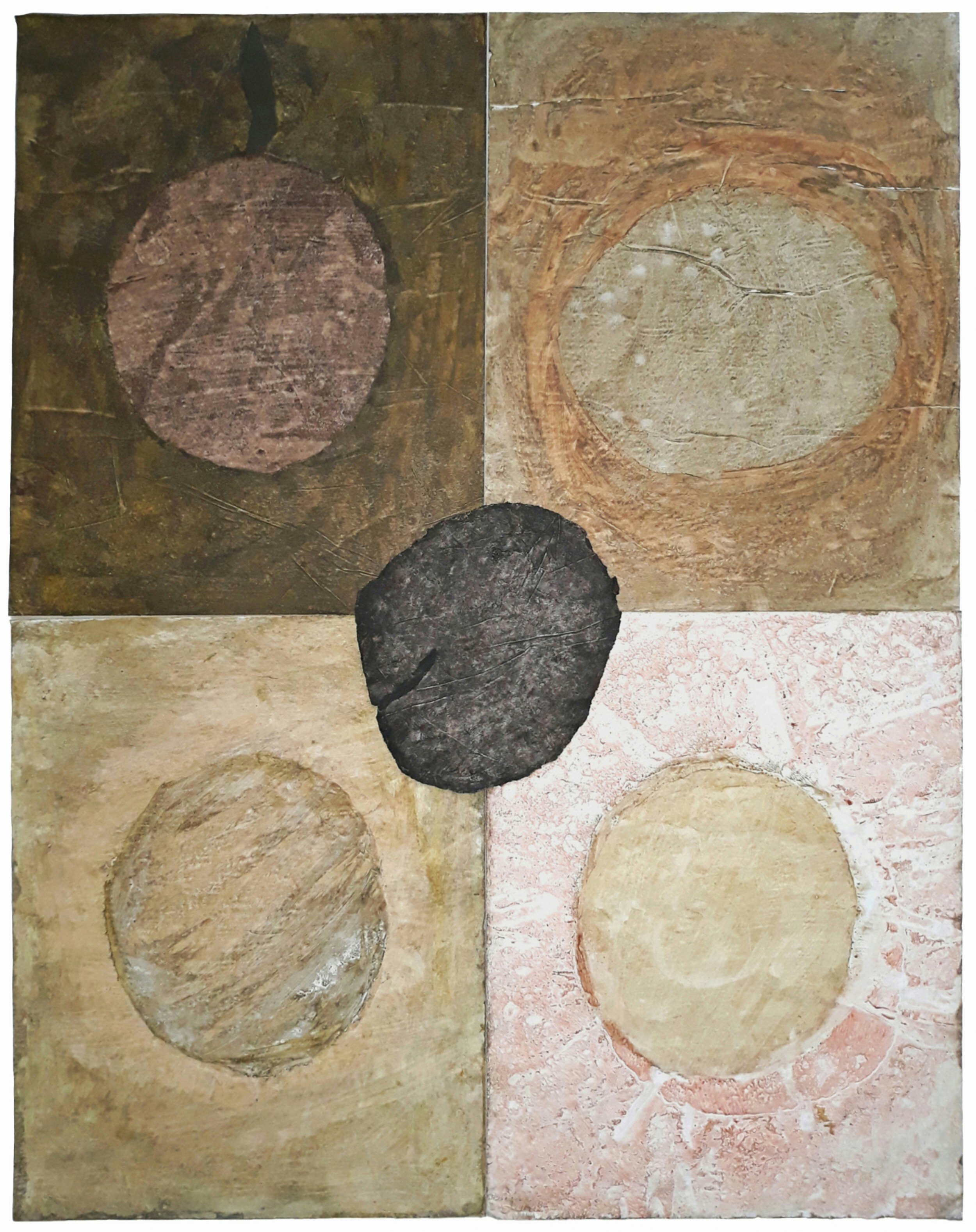 But why this apparent invisibility of the hand? There is no brushwork, little gestural mark-making. The application of color and tone, the creation of texture are all created by basic printing processes – offset, relief, stencil, transfer. Is this legitimate? Why not? The essence of a print being pressure rather than duplication (although that sometimes occurs), in this case simple pressure of the hand itself is where manual expression comes into play, the physical assertion of a human hand at work. I am satisfied.